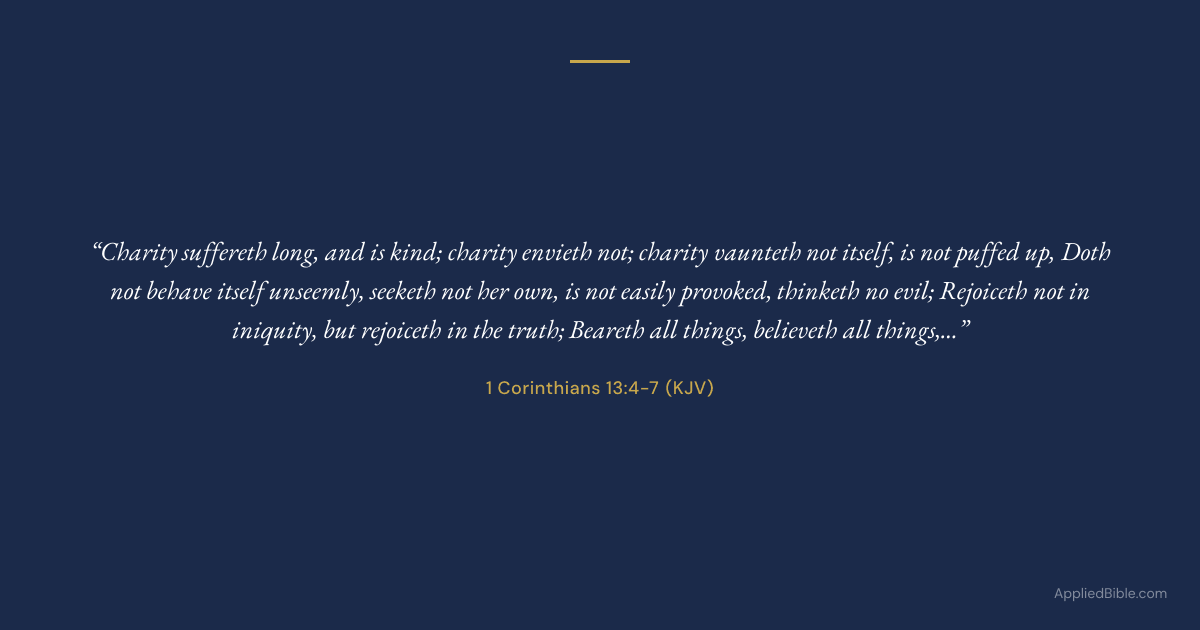 "Charity suffereth long, and is kind; charity envieth not; charity vaunteth not itself, is not puffed up, Doth not behave itself unseemly, seeketh not her own, is not easily provoked, thinketh no evil; Rejoiceth not in iniquity, but rejoiceth in the truth; Beareth all things, believeth all things, hopeth all things, endureth all things."